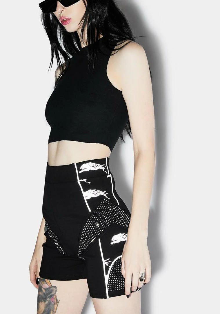 will have you chasing the high. These handmade biker shorts have a high waist fit, a reflective flame panther print on the sides, and rhinestone detailing.