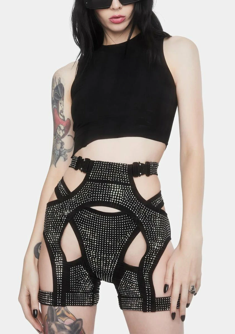 will take you to new dimensions. These handmade biker shorts have a cut-out design all over, sparkling rhinestones and buckle hardware.