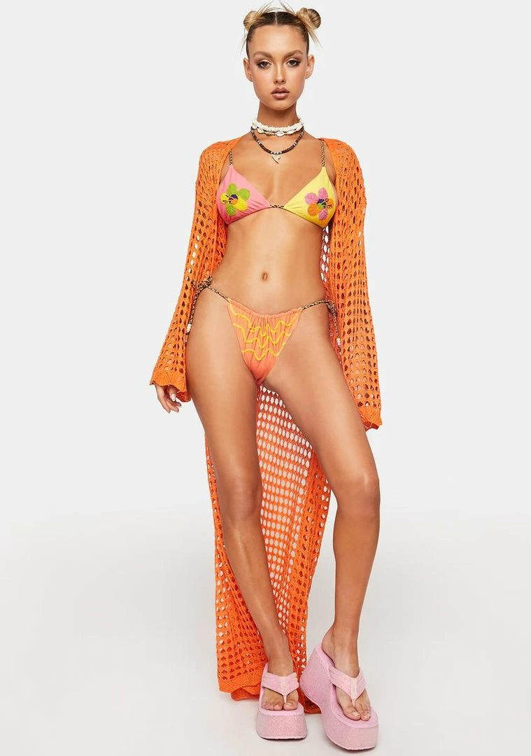 ready for the heat wave. This bikini top has triangle bra cups with beaded flower appliques, adjustable shoulder straps, and contrast animal print ties with pastel bead embellishments.