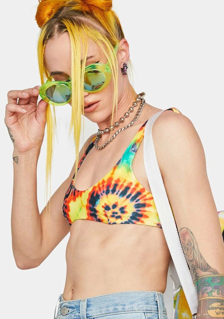 blast from the past! This crop bikini top has a spiral tie dye design and a scoop neckline.