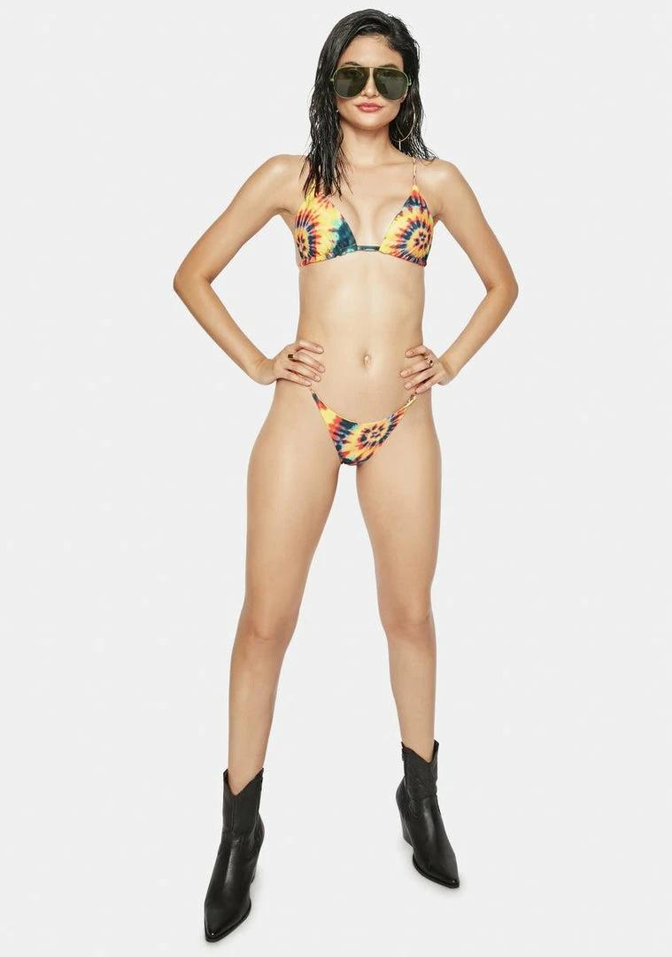 blast from the past! This triangle bikini top has adjustable cups with removable padding, back tie closures, adjustable shoulder straps, and a tie dye print all over.