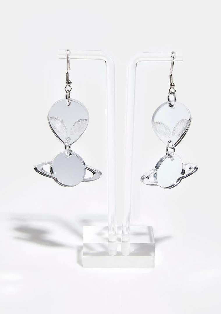 take me to another planet. These drop earrings come in a mirrored construction, with an alien and planet pendant.