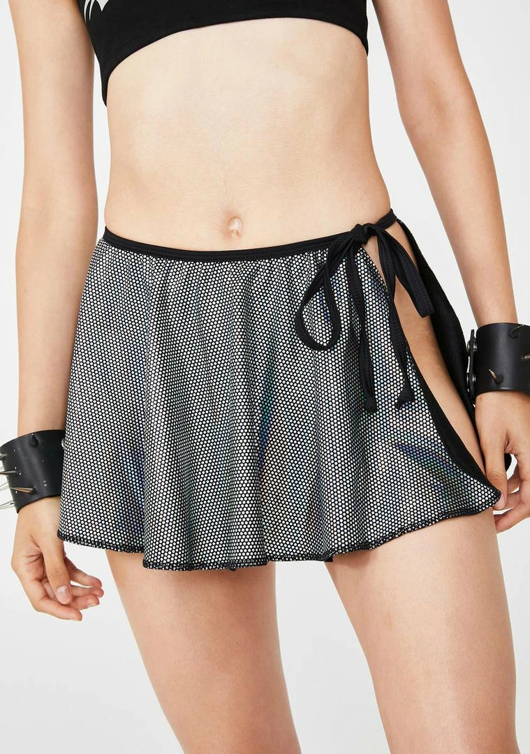 got ya feelinâ the magic, babe! Take âem to wonderland in this handmade mini skirt that has a holographic material, flared fit, and adjustable tie closures for maxxx or minimal coverage.