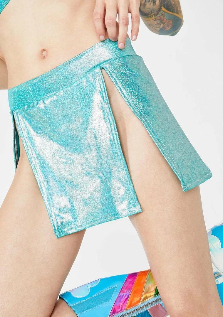 will have ya ready to conquer the dancefloor! Break it down in this supa cute mini skirt that has an shininâ iridescent material, sexxy front slits, and an elastic waistband.