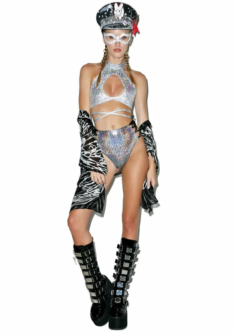 …so letâs take on this night together, bb~ This amazing cropped top features an insane silver holographic construction, high halter neck, center chest cutout, and exxxtra long crossed waist wraparound straps that tie in tha back.