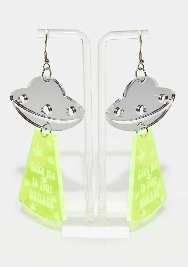 beam me up! These acrylic earrings are shaped like UFOs with neon light beams that have embossed weed leaves and say “Take Me To Your Dealer.”