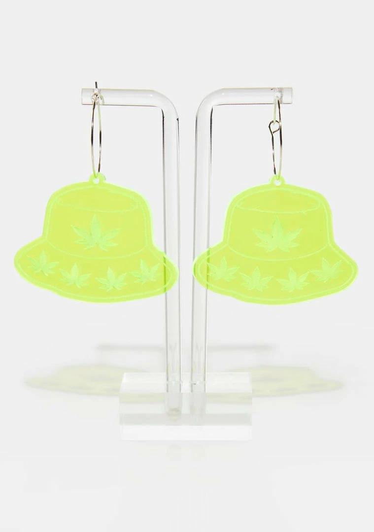 smokin’ hot from head to toe. These hoop earrings have a translucent neon acrylic design and are shaped like bucket hats with weed leaf embellishments.