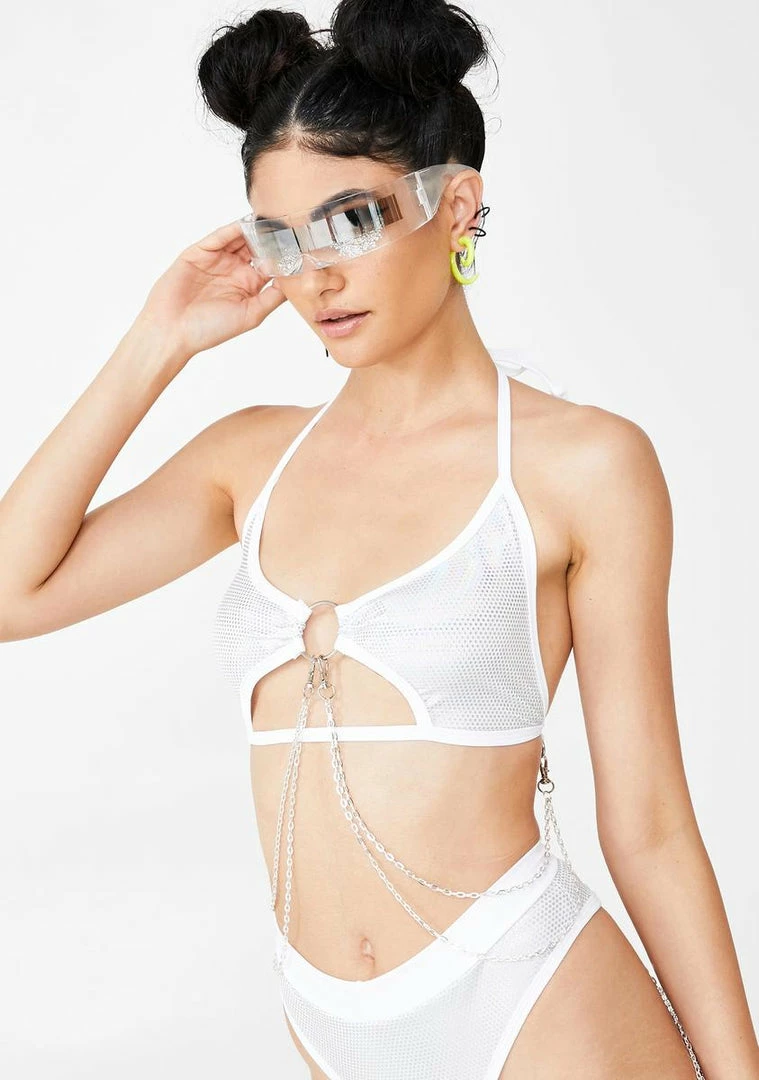 will have ya causinâ some trouble! Youâre naughty on the dance floor in this handmade holographic bra top that has adjustable tie closures, O-ring hardware, and draped chains on the front.