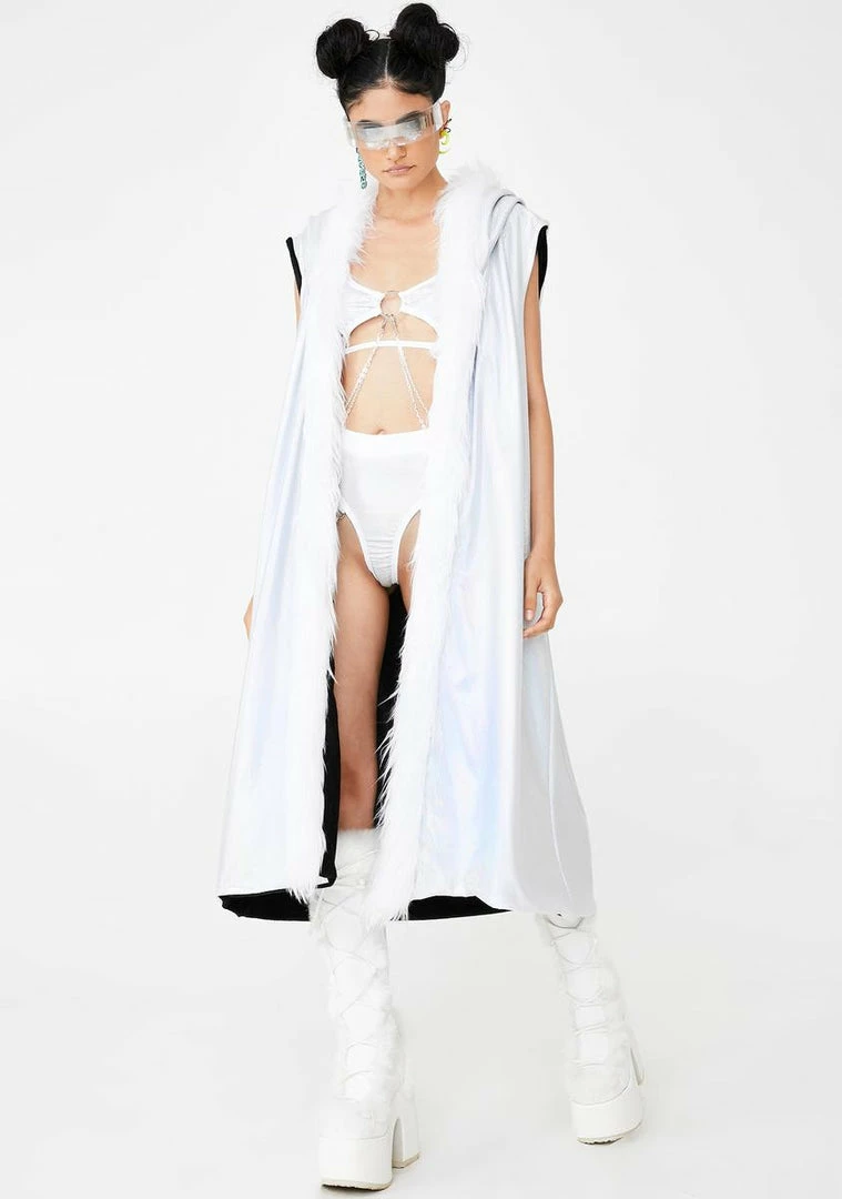 cuz youâre a digital diva! Get light years away in this handmade reversible hooded duster that has faux fur trim, a holographic material on one side, and a cozy black fleece lining on the other.