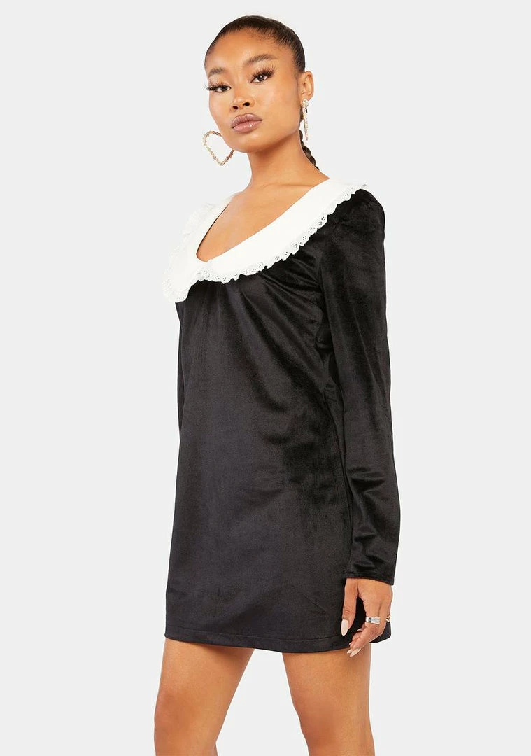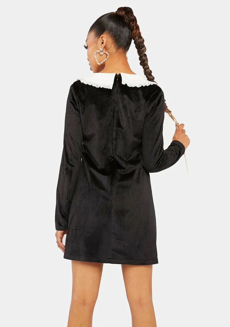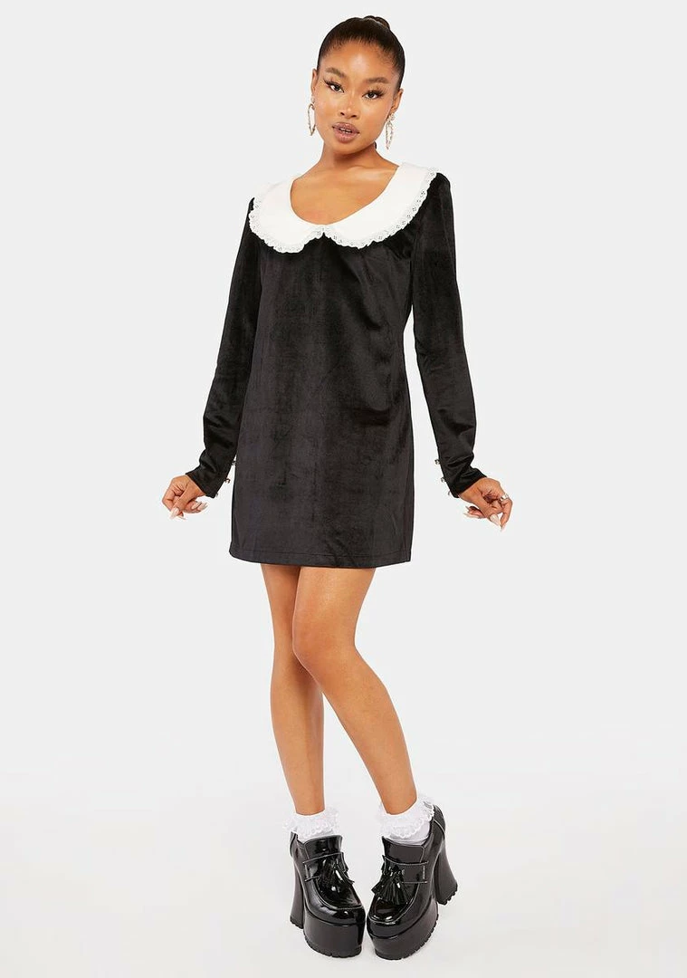 has a soft velvet construction, a scoop neckline with a peter pan collar, faux pearl embellishments at the sleeve cuffs, and an invisible back zipper closure.