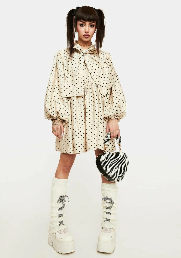 it doesn’t get better than this! This mini dress has a heart jacquard print, a large bow at the neckline, long puff sleeves, and a full skirt.