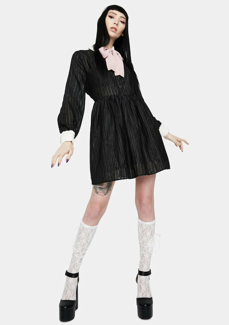 features a ribbed construction, cinched waist, contrast pearl studded wrists and peter pan collar, and big bow at the neck.