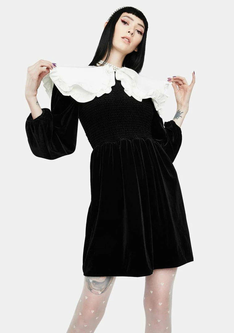 features a velvet construction, oversized peter pan collar with frilly trim, long puff sleeves, and a cinched waist.