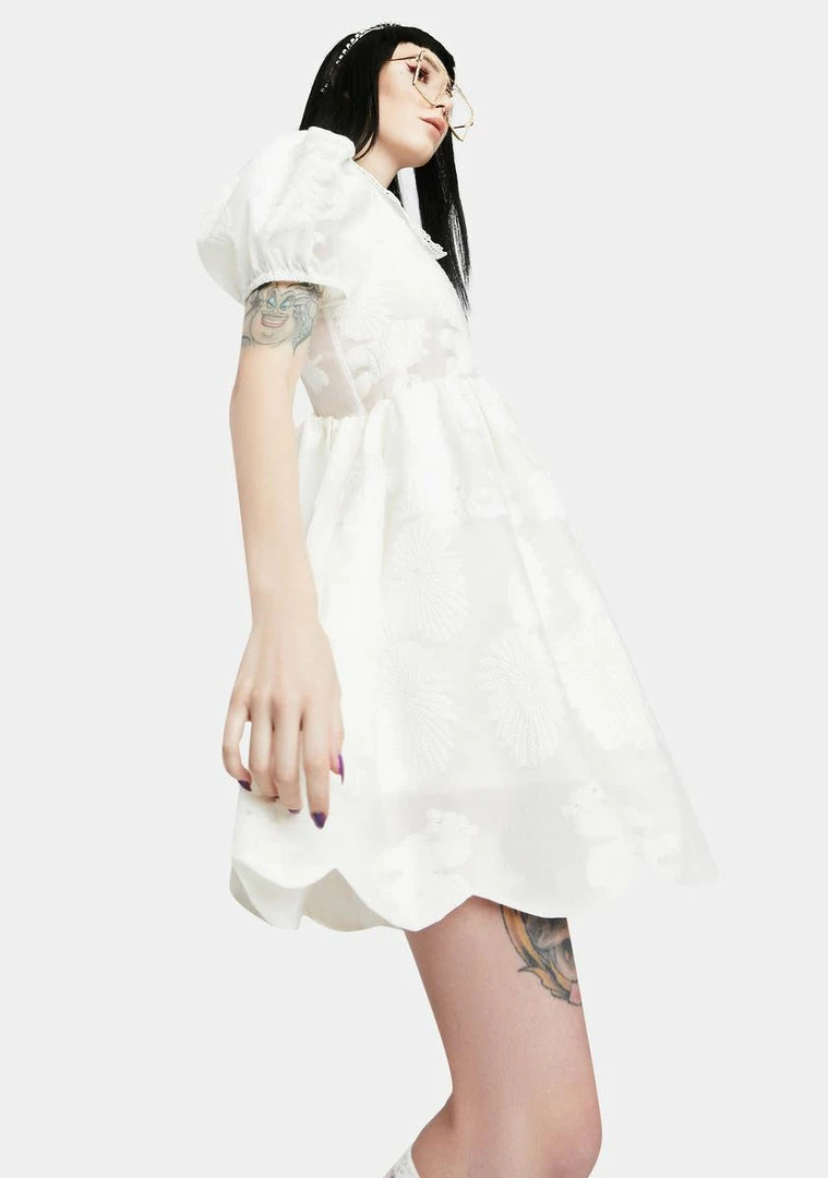 features a cinched waist, jacquard pattern, scalloped hem, short puff sleeves, and super big n glitzy peter pan collar.