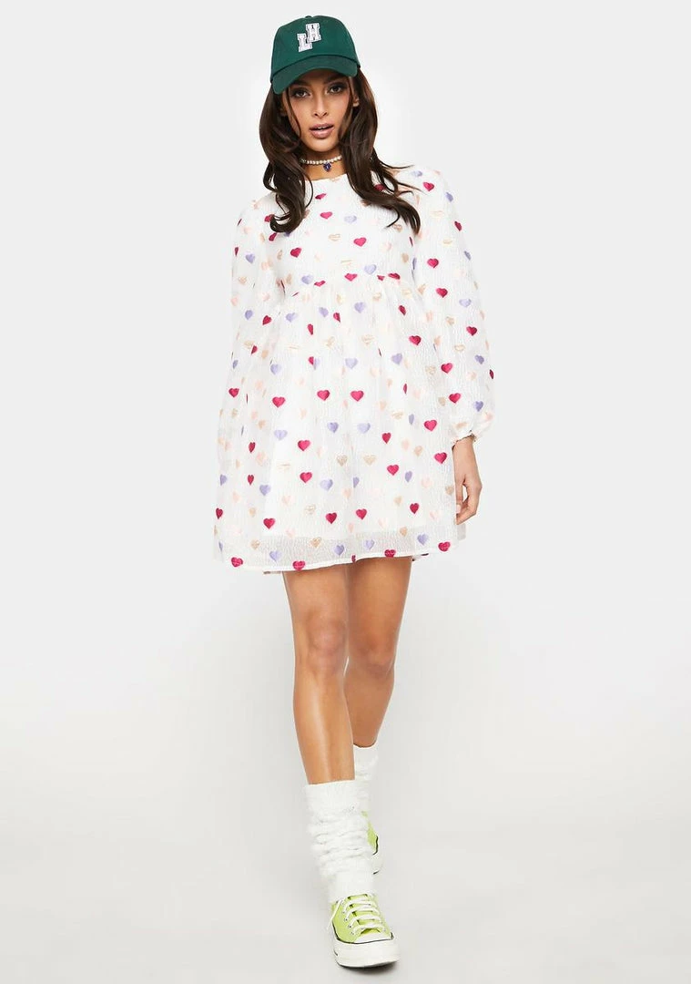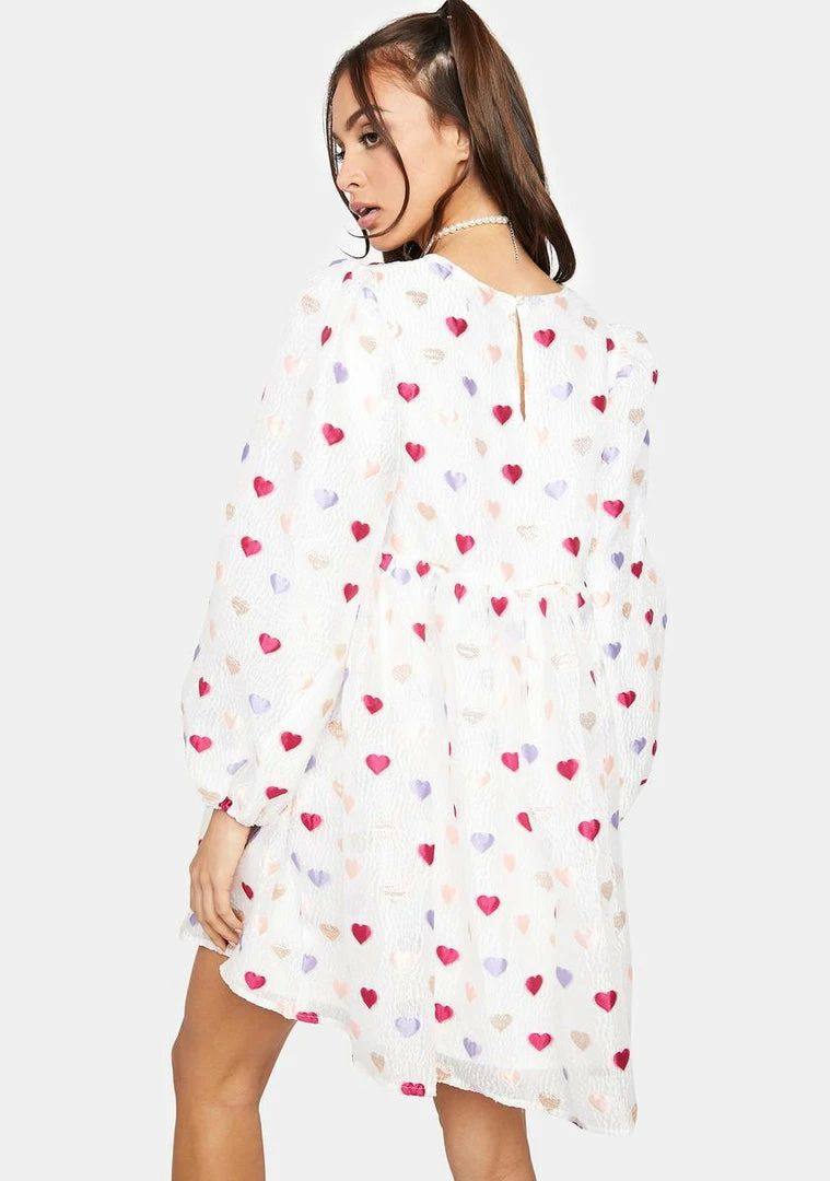 cuz your love is blinding. This oversized mini dress comes with long puff sleeves and a multicolor heart pattern.