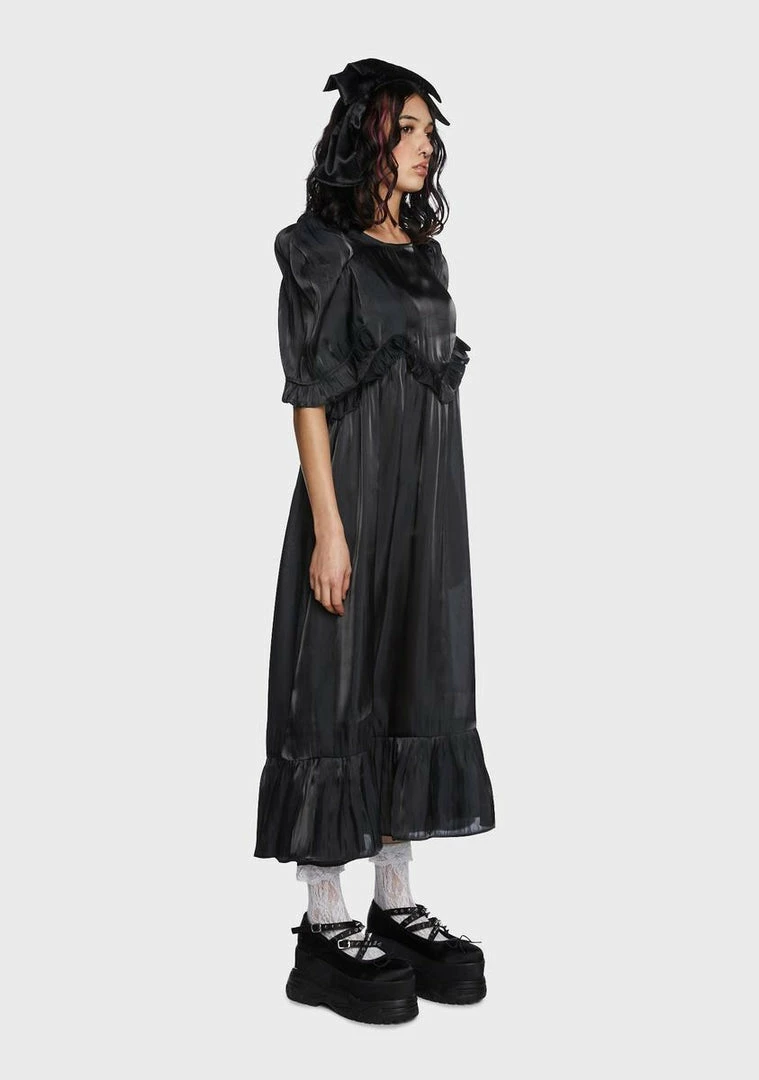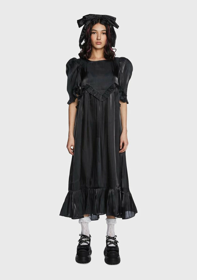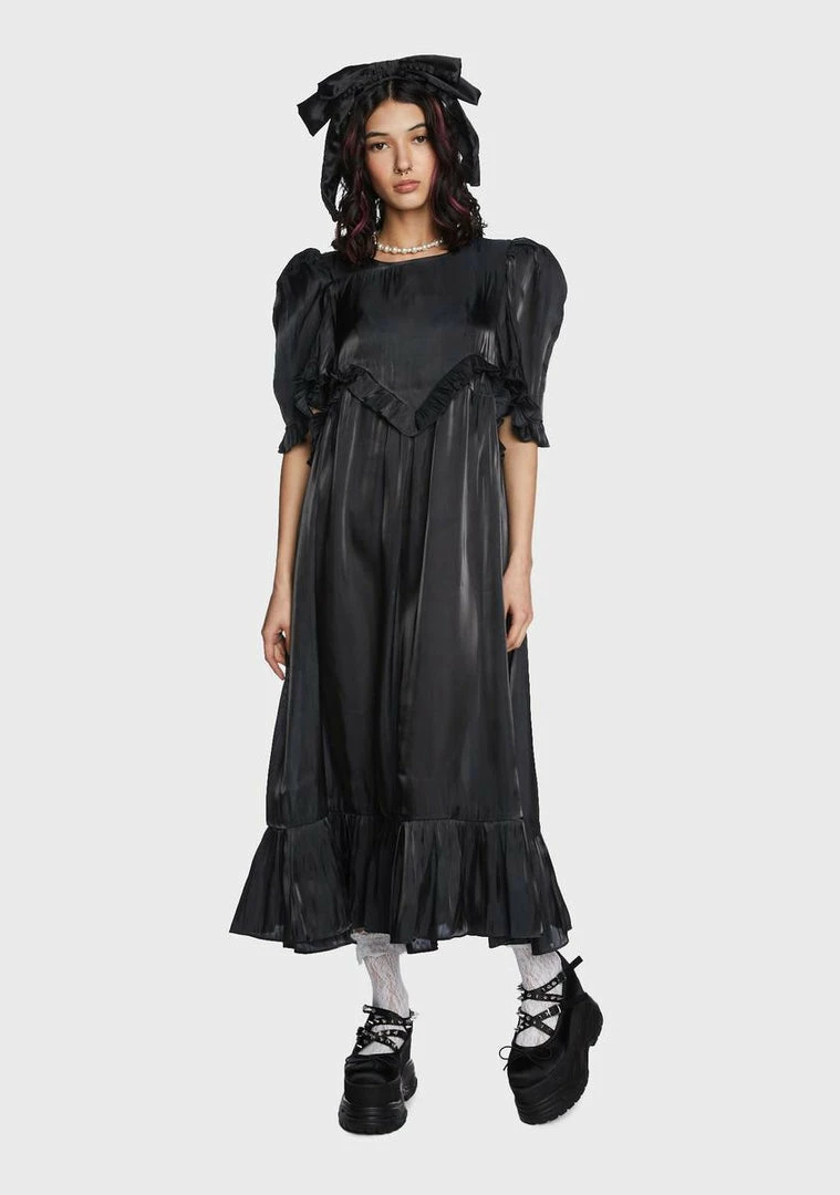 got your look on pointe! This midi dress has a silky taffeta construction, an oversized silhouette, ruffle trim, short puff sleeves with padded shoulders, and adjustable ties at back.