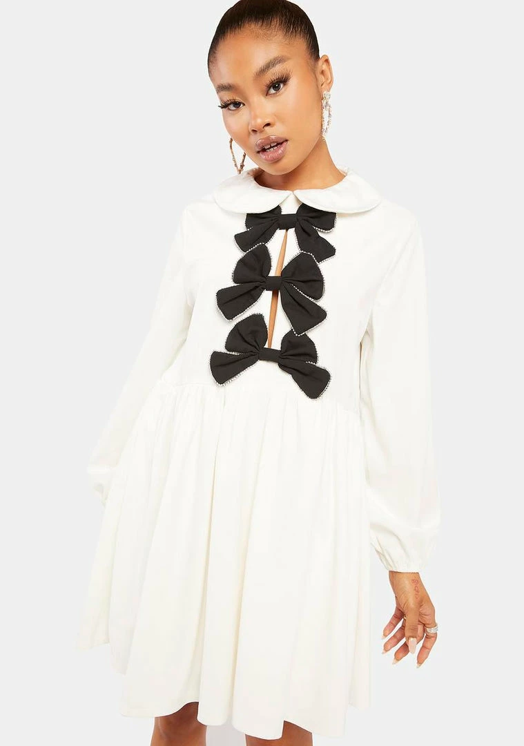 has a soft velvet construction, a peter pan collar, contrast black bow embellishments down the chest, long sleeves, and a cinched waist.