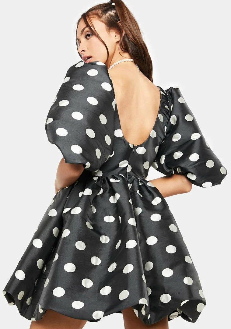 itâs your (show)time. This mini comes with a polka dot print, a scoop neck at the front and back, and puff elasticated sleeves.